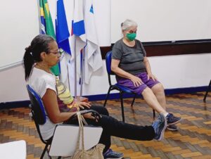 Durante o encontro, os participantes realizaram exercícios funcionais adaptados a diferentes níveis de capacidade física. As atividades, conduzidas de forma dinâmica em pé e sentados, utilizaram acessórios simples, como bolinhas de borracha, para estimular a coordenação motora e os movimentos articulares. A fisioterapeuta priorizou a segurança, o conforto e o respeito às individualidades, garantindo a participação de todos.