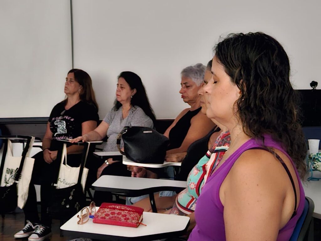 A atividade contou a meditação Anapana, também conhecida como atenção plena à respiração. Trata-se de uma técnica de origem budista que consiste na observação consciente da respiração, sem interferências, favorecendo a clareza mental, a tranquilidade e o bem-estar. A prática proporcionou momentos de serenidade e concentração, fundamentais para o fortalecimento da atenção e da presença no momento presente.