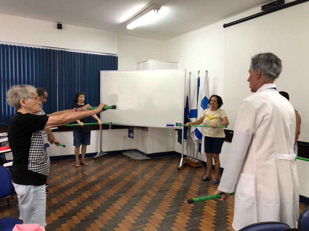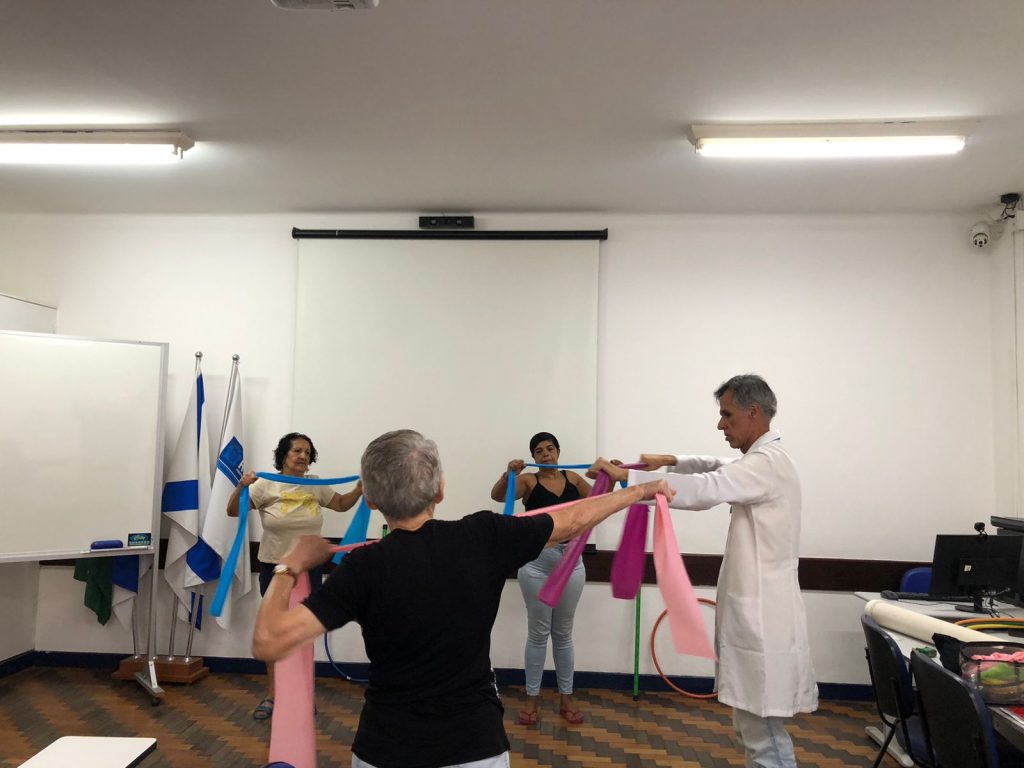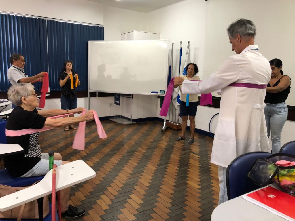 Durante o encontro, os participantes realizaram atividades voltadas ao fortalecimento muscular e à melhora da flexibilidade, utilizando bastão e faixas elásticas como apoio. Os exercícios envolveram movimentos com braços, pernas e cabeça, estimulando a coordenação motora e a mobilidade corporal. A proposta priorizou a eficácia dos movimentos, aliada à segurança e ao conforto dos participantes, respeitando o ritmo e as limitações individuais de cada um.