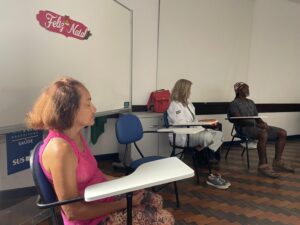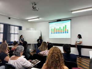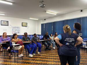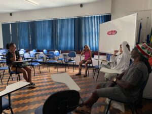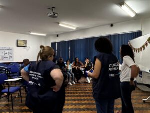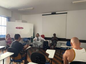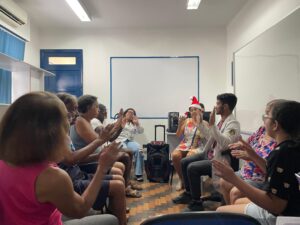 Em um segundo momento, a terapeuta propôs uma roda de conversa com o objetivo de estimular as capacidades cognitivas dos participantes. Durante a atividade, os presentes foram convidados a compartilharem suas ideias e experiências, promovendo a interação e o exercício da memória, raciocínio e linguagem. A dinâmica favoreceu um ambiente de troca e aprendizado, incentivando o pensamento criativo e o fortalecimento das habilidades cognitivas de forma leve e colaborativa.